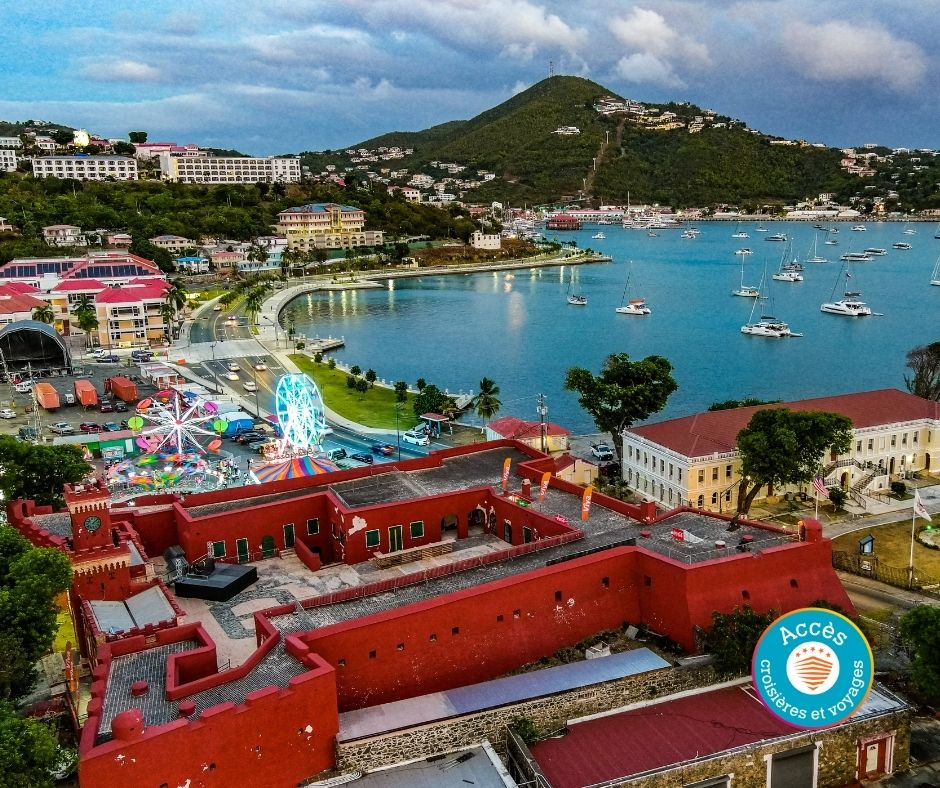 Charlotte Amalie, Saint-Thomas : Charlotte Amalie est la capitale enchanteresse de Saint-Thomas, qui a attiré pirates et marins du monde entier pendant des siècles. L’île offre un fascinant mélange d’influences danoises, françaises, espagnoles, ouest-africaines et caribéennes. Une croisière à Saint-Thomas regorge de découvertes. Pour un aperçu complet de l’histoire de l’île, visitez le Fort Christian Museum. Construit comme fort militaire par les Hollandais en 1680, ce site historique abrite des expositions retraçant l’histoire des îles Vierges de l’âge de pierre à nos jours, ainsi que des collections d’histoire naturelle et une galerie d’art. Appréciez la beauté des plages de Saint-Thomas en pique-niquant sur la plage de Magens Bay ou en explorant les eaux turquoise de la mer des Caraïbes avec masque et tuba. Vous pourrez y admirer de près coraux, éponges et bancs de poissons tropicaux multicolores. Les restaurants proposent d’authentiques plats insulaires, comme de savoureux currys accompagnés de roti, des fruits de mer ultra-frais et de délicieux cocktails à base des meilleurs rhums locaux. Et, bien que les plages et l’océan soient magnifiques, il y a une chose qui distingue vraiment Saint-Thomas : le shopping. Cette île est la plus commerçante de toutes les îles Vierges américaines. Flânez dans les rues bordées de boutiques de la capitale et dénichez des souvenirs hors taxes et des bonnes affaires sur tout, des spiritueux à la porcelaine et au cristal importés.