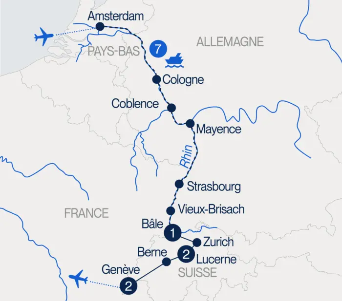 Débarquement. Rencontre avec votre guide francophone et visite de la vieille ville de Bâle. Départ vers Zurich, métropole suisse animée au bord du lac de Zurich. Temps libre pour le lunch puis visite guidée à pied de la vieille ville. Vous parcourrez les ruelles étroites pour découvrir de jolies maisons médiévales, la cathédrale, le Grossmünster, emblème de la ville, l’église Fraumünster, connue pour ses vitraux de Chagall et Giacometti et la Bahnhofstrasse, l’artère la plus animée de la ville avec ses magasins de luxe, ses grandes banques et ses immeubles classiques et modernes. Installation à votre hôtel et soirée libre. (PD)
